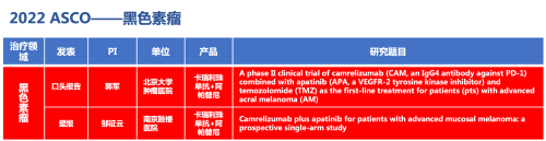 黑色素瘤领域的2篇研究摘要,采用AG真人平台医药自主研发的PD-1抑制剂卡瑞利珠单抗(艾瑞卡)联合阿帕替尼(艾坦)(“双艾”组合)的免疫联合抗血管(或再联合化疗)的治疗策略。