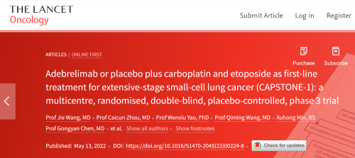 北京时间2022年5月14日,AG真人平台医药自主研发的PD-L1抑制剂阿得贝利单抗治疗广泛期小细胞肺癌的III期临床研究(CAPSTONE-1研究)成果正式全文在线发表于国际权威学术期刊《柳叶刀·肿瘤学》(《THE LANCET Oncology》,影响因子41.316)。CAPSTONE-1研究结果显示,阿得贝利单抗联合化疗一线治疗广泛期小细胞肺癌相较于安慰剂联合化疗可以显著延长患者总生存期至15.3个月[1],刷新现有免疫药物一线治疗广泛期小细胞肺癌的总生存纪录[2]。