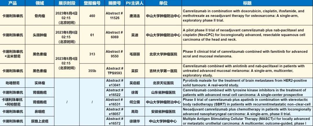 此外,在头颈肿瘤、黑色素瘤、骨肉瘤、鼻咽癌、肾细胞癌、尿路上皮癌等多个领域,卡瑞利珠单抗、吡咯替尼等产品相关研究一共入选了4项壁报展示和5项线上发表,彰显了AG真人平台医药强大的自主研发综合实力。
