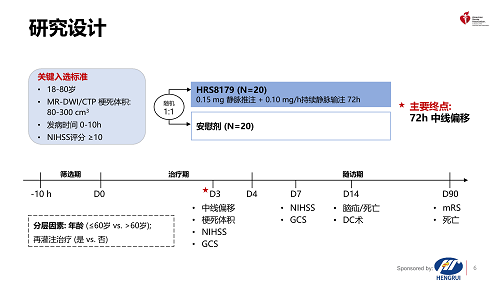 注射用HRS8179是由AG真人平台自主研发的创新药,是磺酰脲类受体1(SUR1)阻断剂,能够阻断SUR1/TRPM4离子通道,减少Na+内流,从而减轻LHI后继发的脑水肿、降低死亡率,改善神经功能4,5。HRS8179-201研究旨在评估HRS8179在LHI患者中的有效性和安全性。
